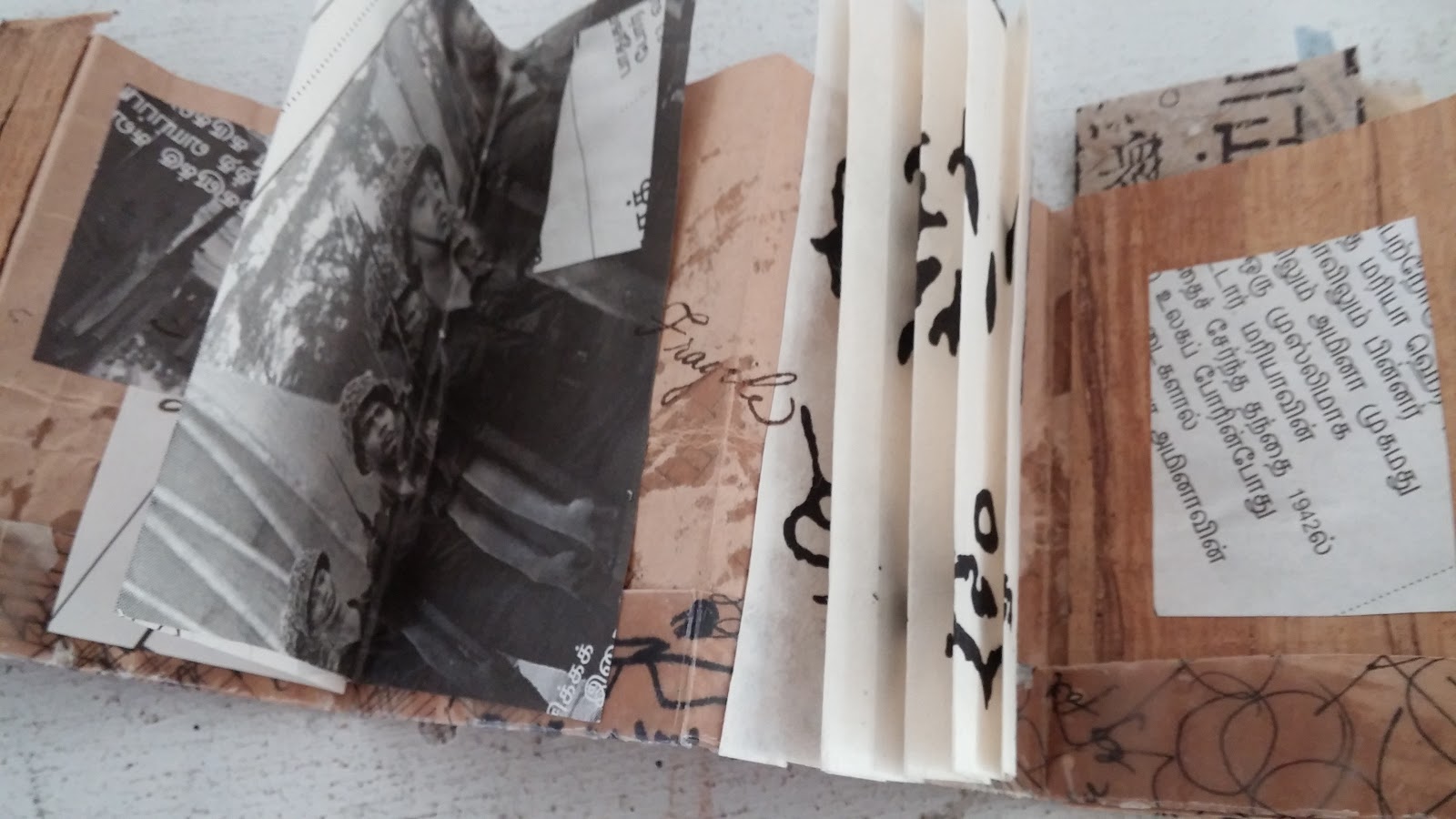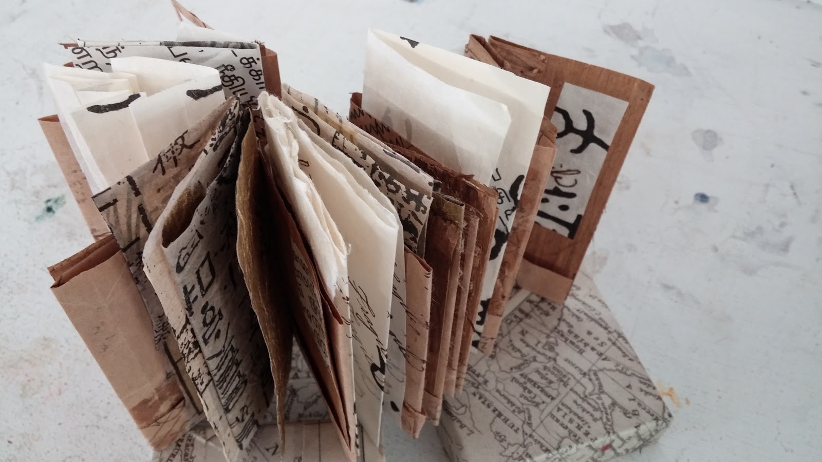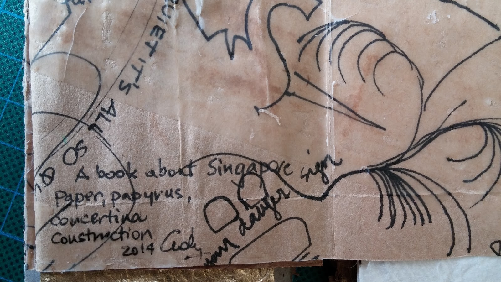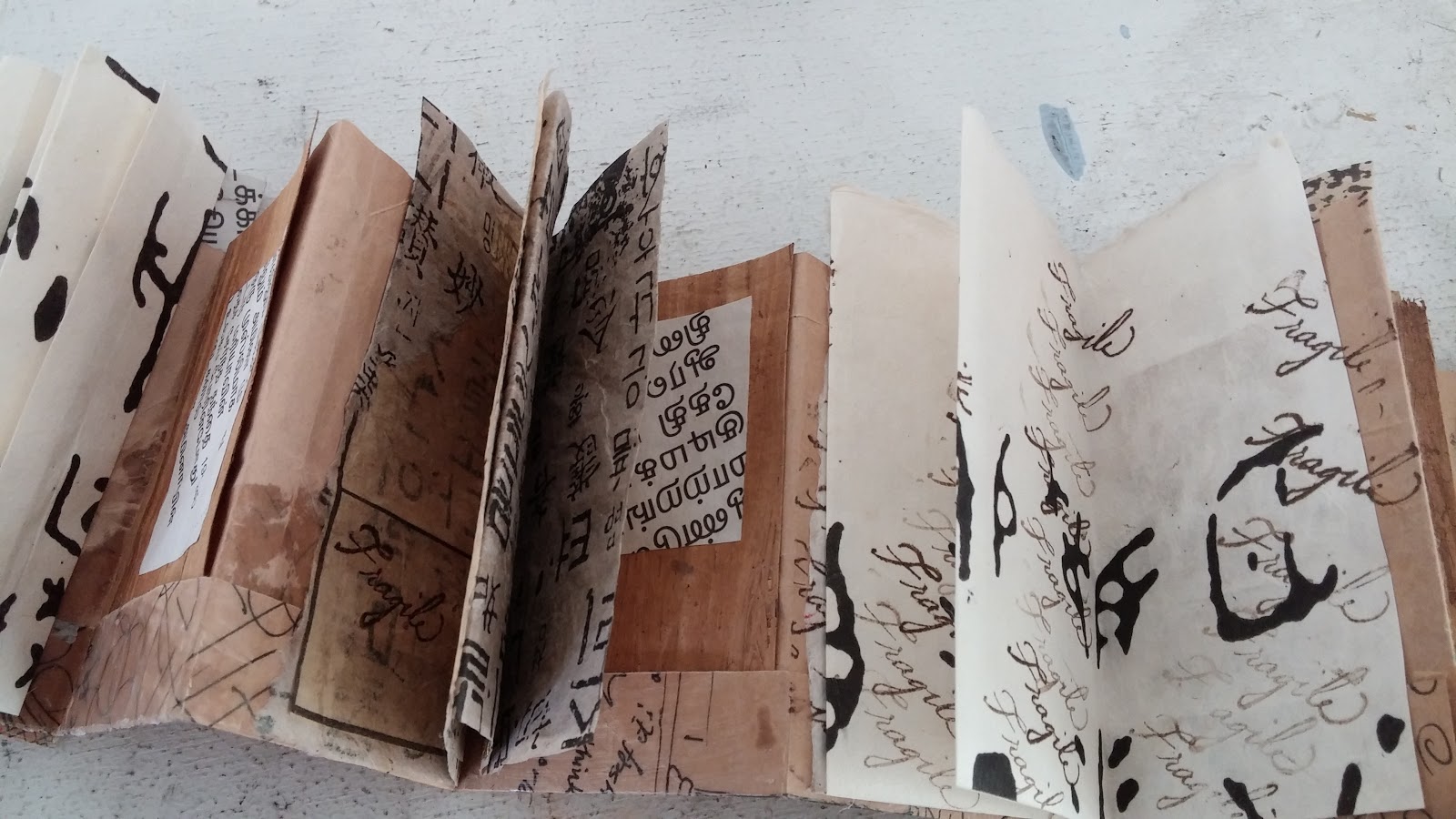 The brown paper which forms the concertina (the core of the book) was the brown paper bag in which I bought a tiny Japanese bell with an amazing tinkle. I bought the bell in Singapore.