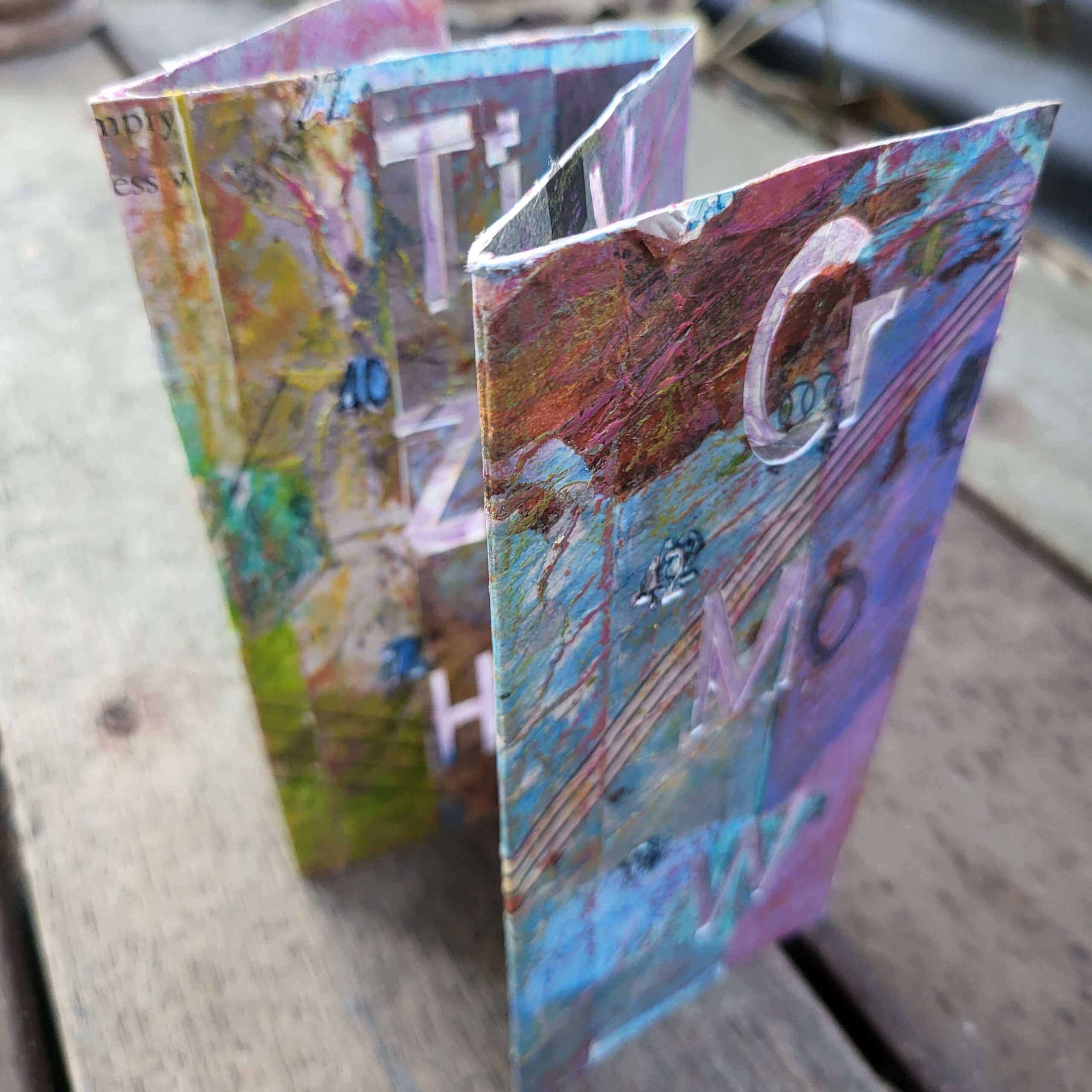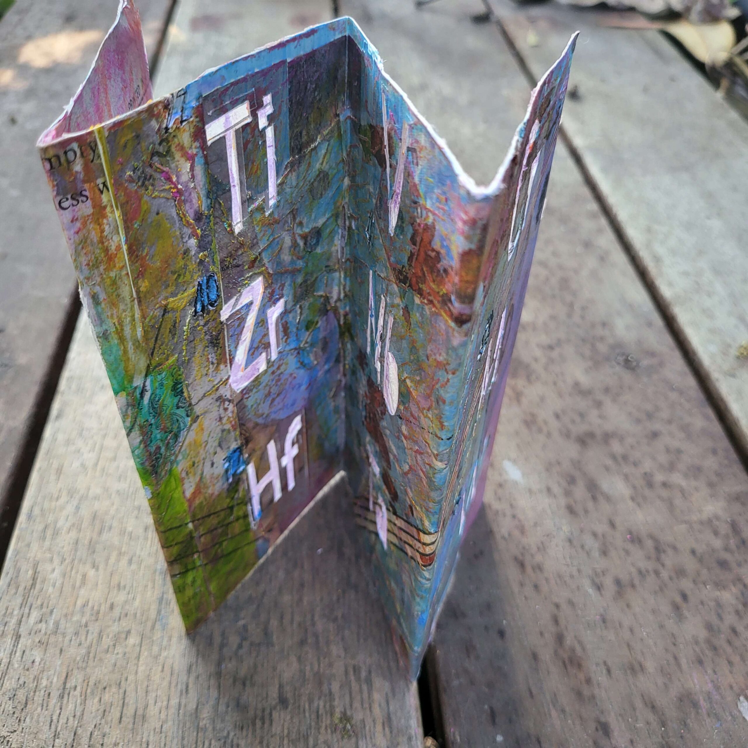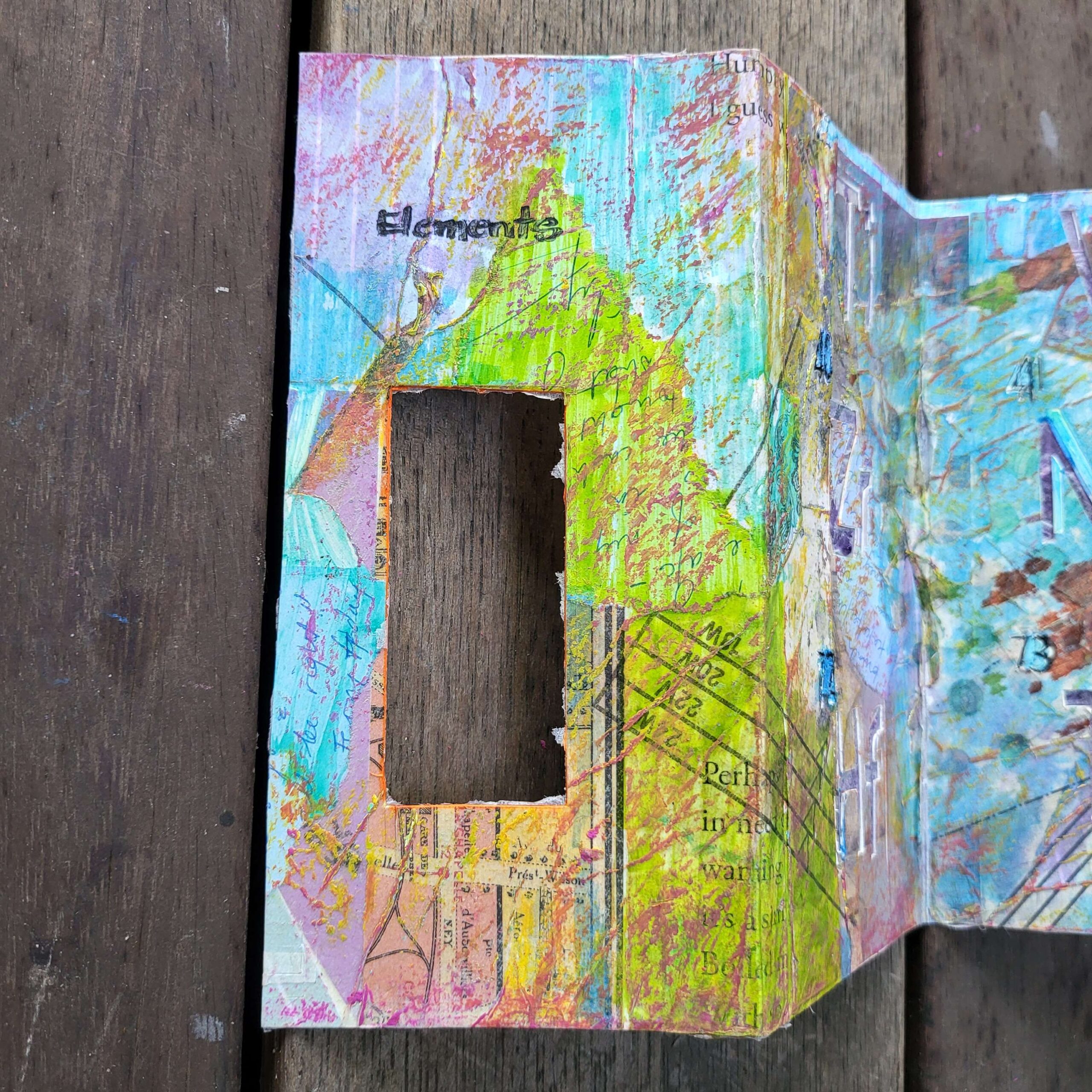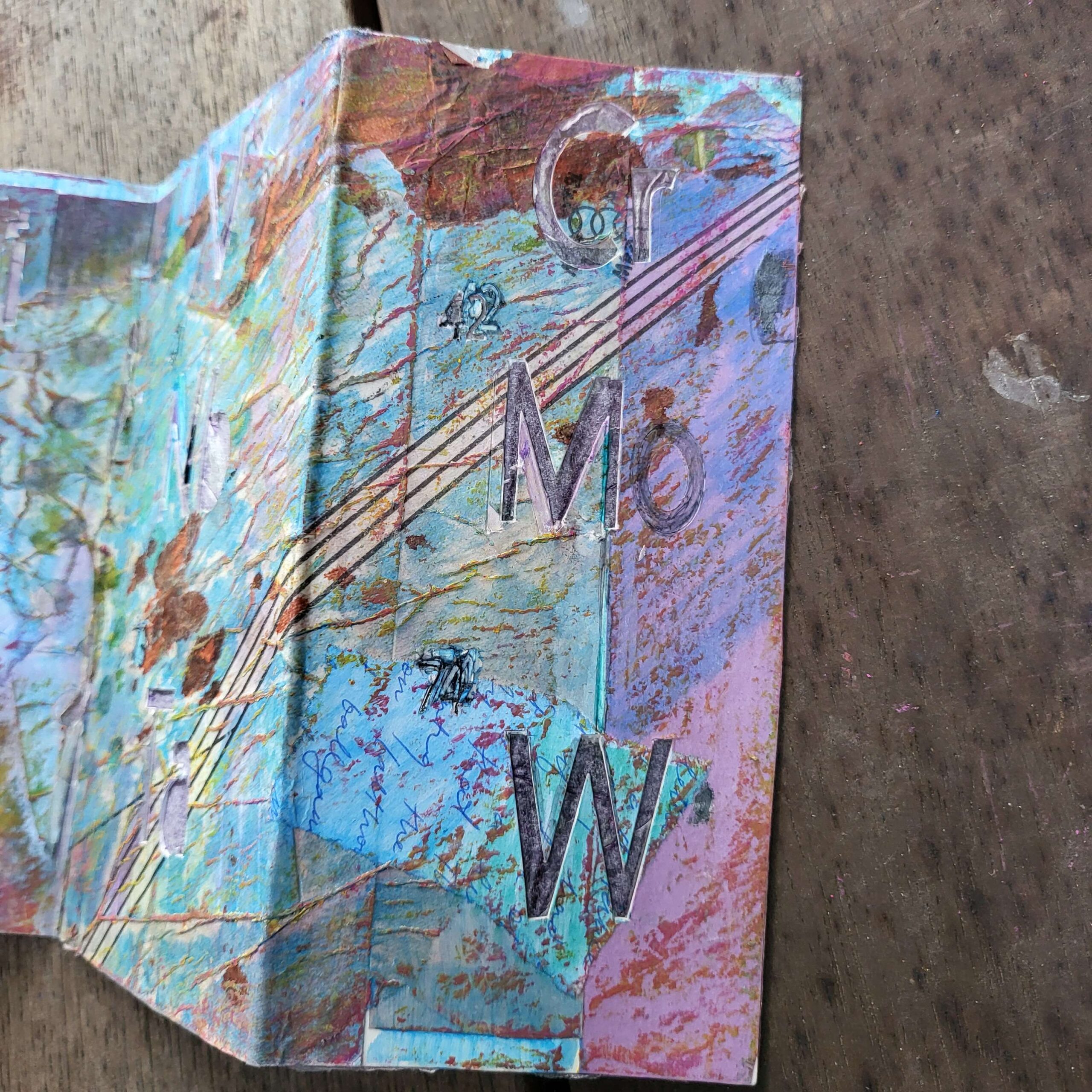 So I thought because the look of it had pleased me so much that I could make a book. This was an offcut of card. I literally stuck down a few pretty things I had lurking on my desk, and then got my cricut to cut out the letters. It failed because I had incorrectly specified the gsm of the paper (it’s never right anyway, it’s less right when there’s collage and oil pastel on it). That means the cricut failed to cut through.