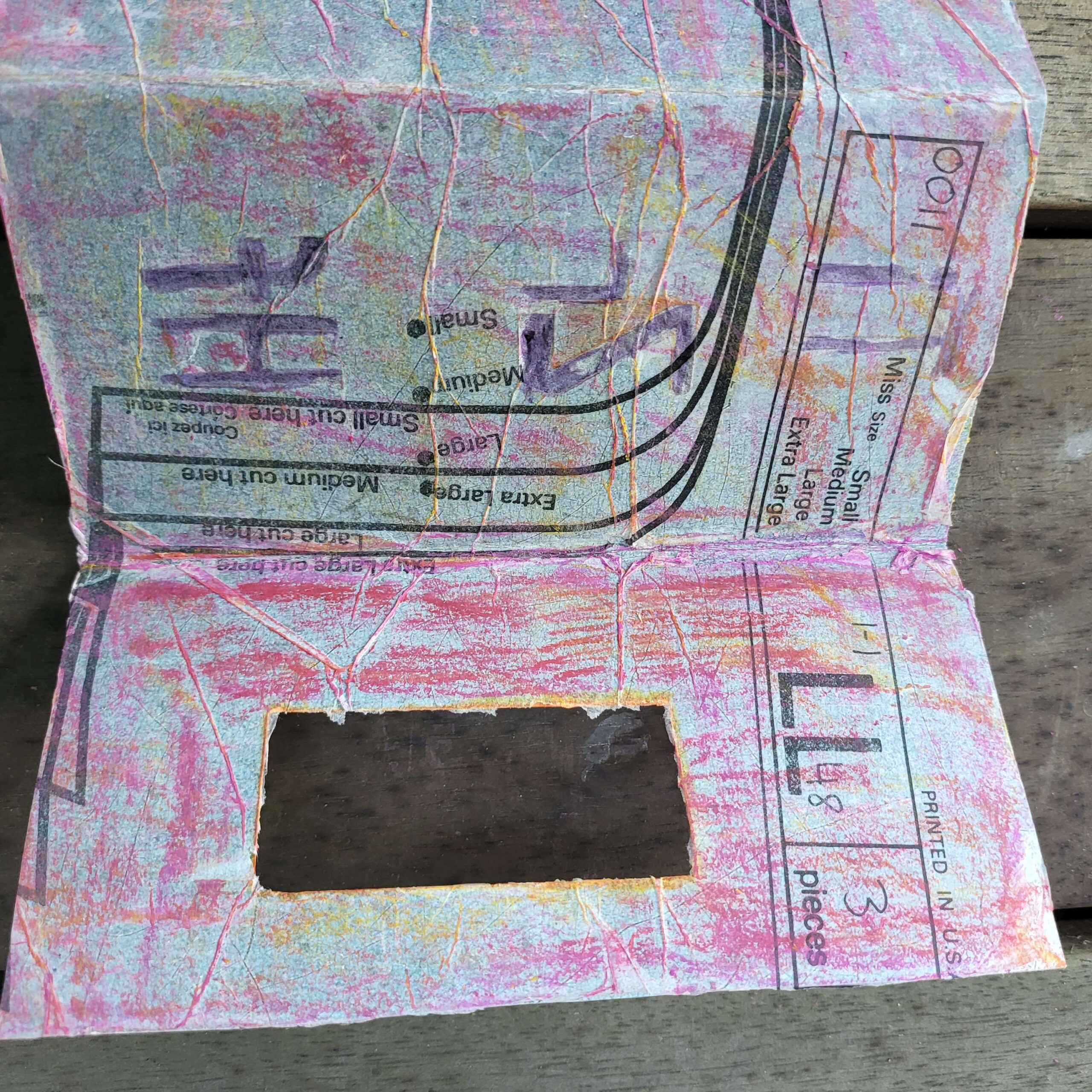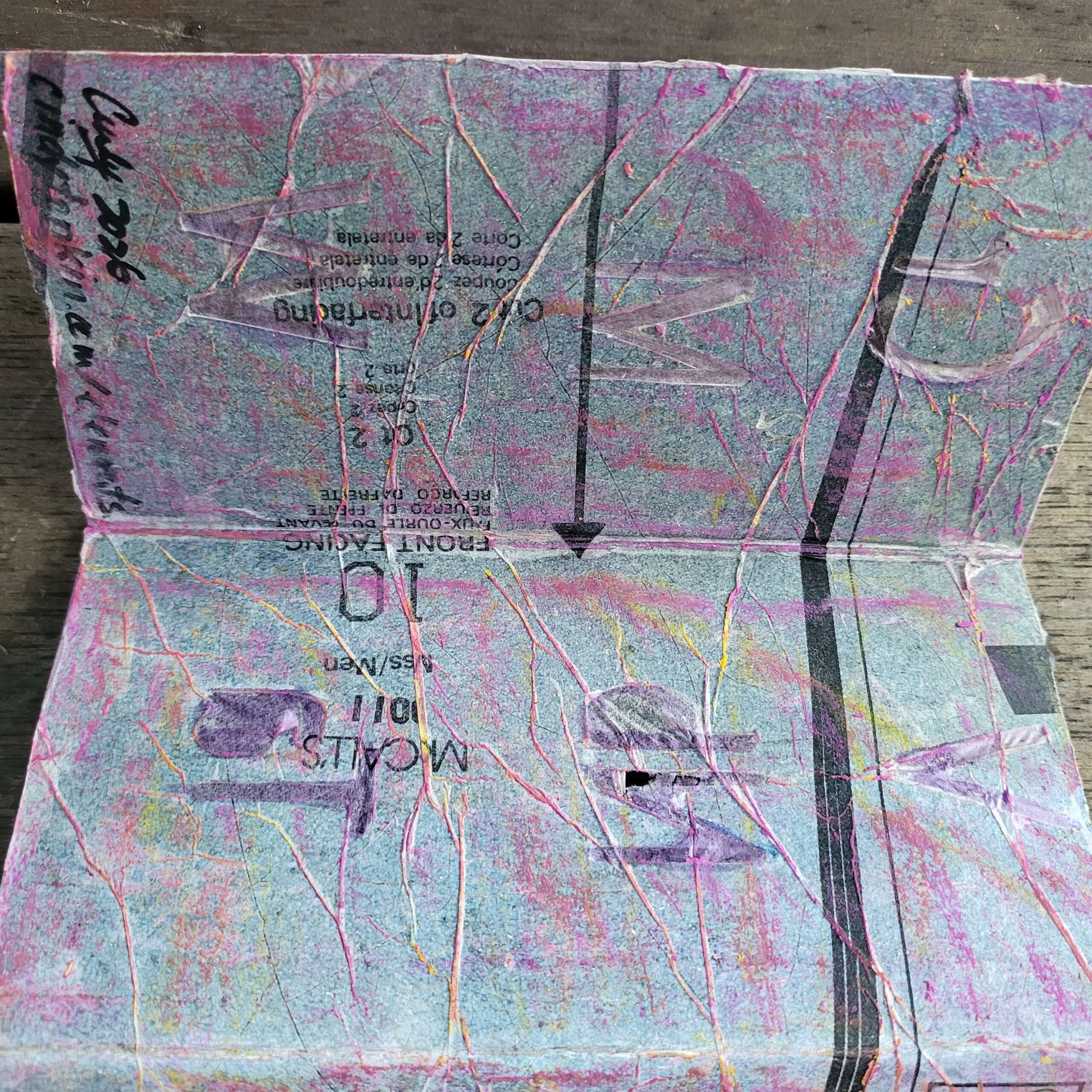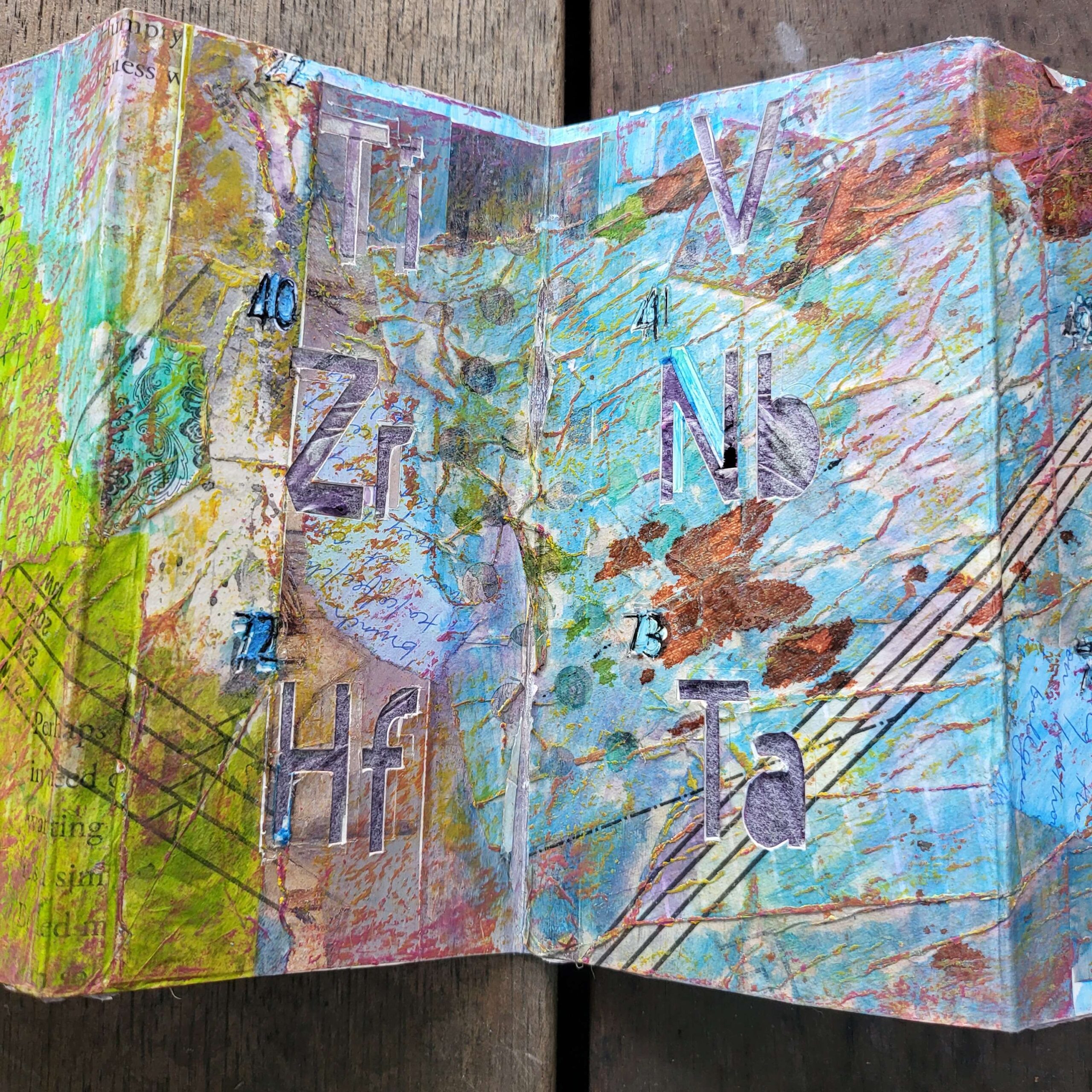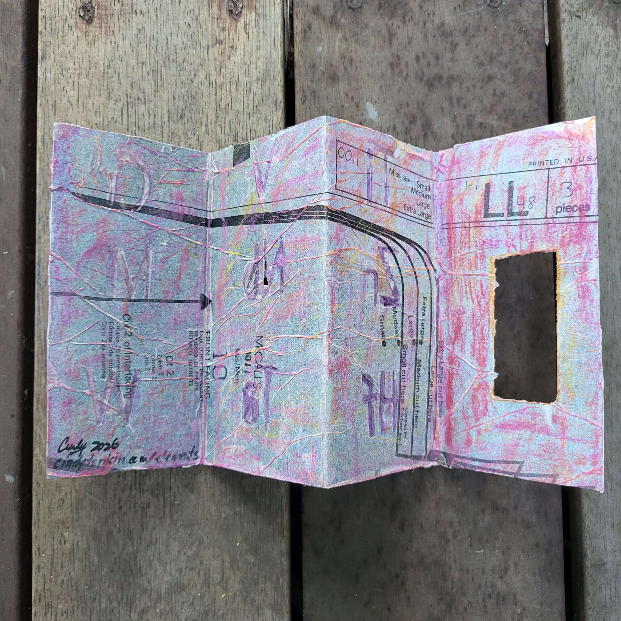 So I thought because the look of it had pleased me so much that I could make a book. This was an offcut of card. I literally stuck down a few pretty things I had lurking on my desk, and then got my cricut to cut out the letters. It failed because I had incorrectly specified the gsm of the paper (it’s never right anyway, it’s less right when there’s collage and oil pastel on it). That means the cricut failed to cut through.