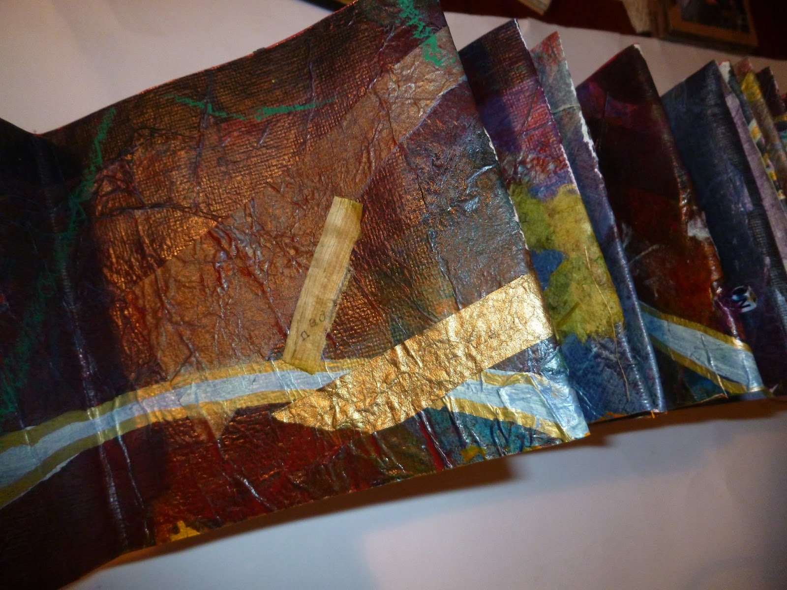 This book was made from an old acrylic work. I then decorated the back of the work with oil pastel, dress pattern tissue and acrylic washes. The challenge I always have is that often I prefer the back after I’ve decorated it. So having this be a concertina gets over that problem!