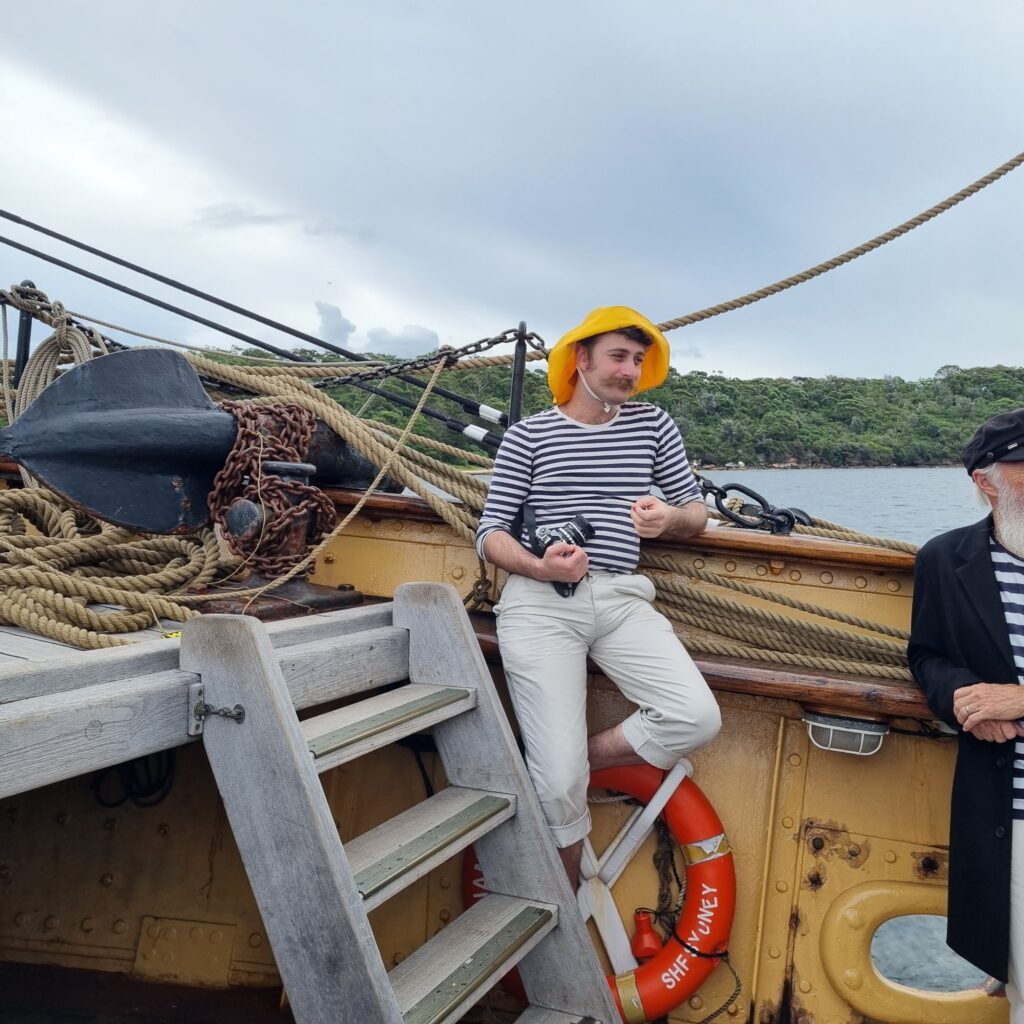 Daniel Bornstein of the Grubby Urchins in character with camera on the James Craig in Sydney Harbour, 2022. to the right is Don Brian’s ear.