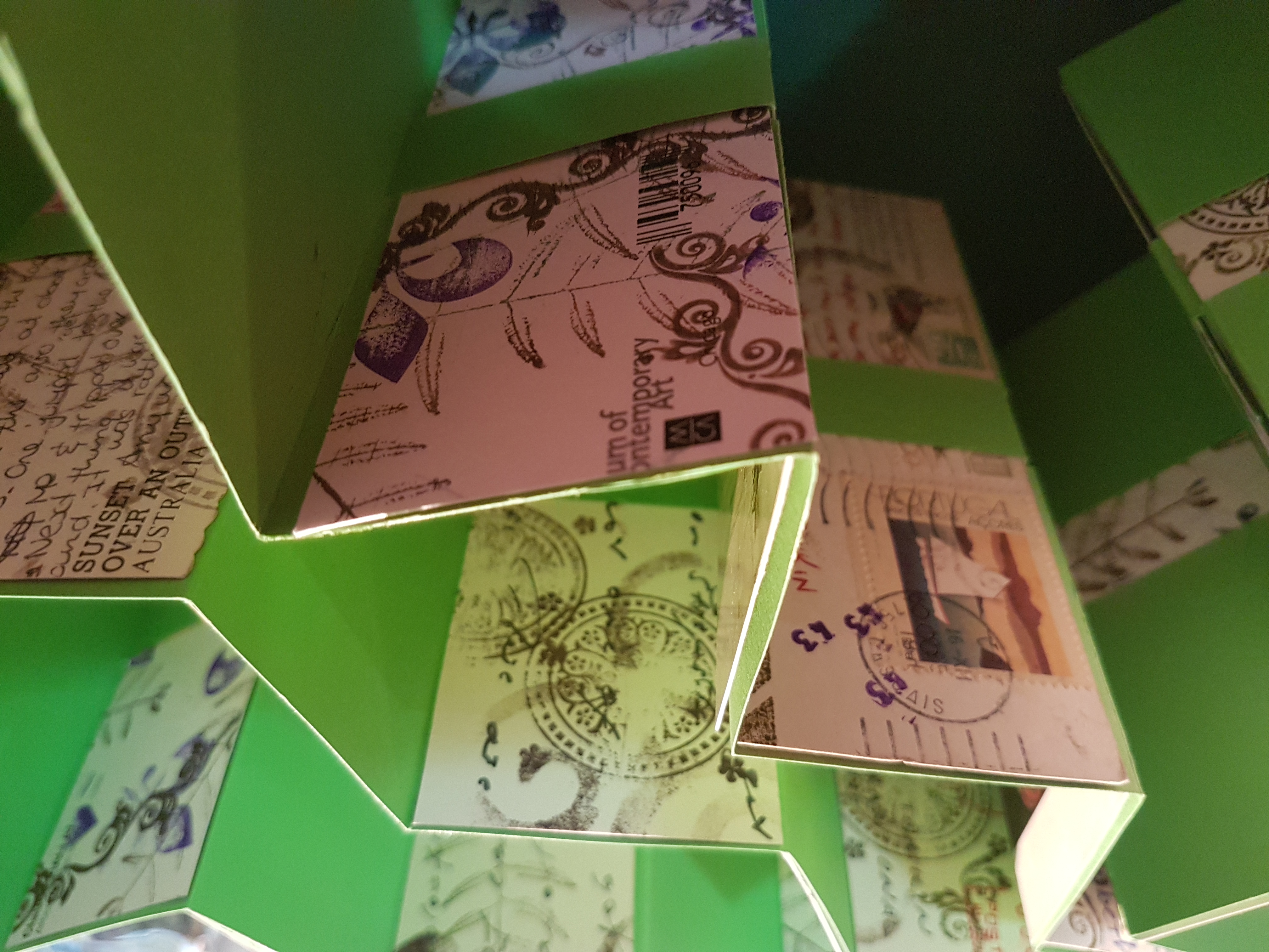This is a collage of all of the postcard offcuts. I anticipate a few more of these, since I’ve not even scanned all of the cards yet, and I’ve already made a number of works.