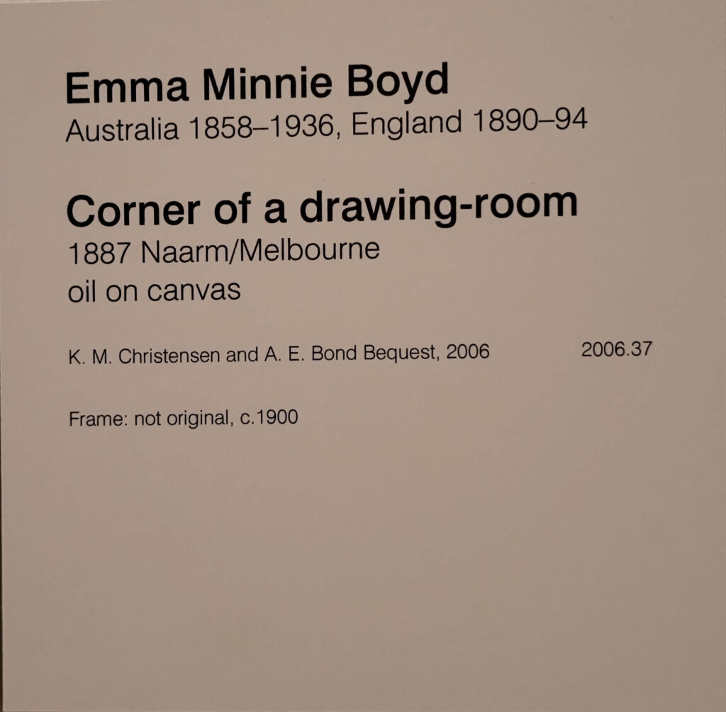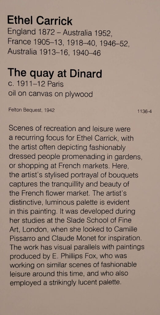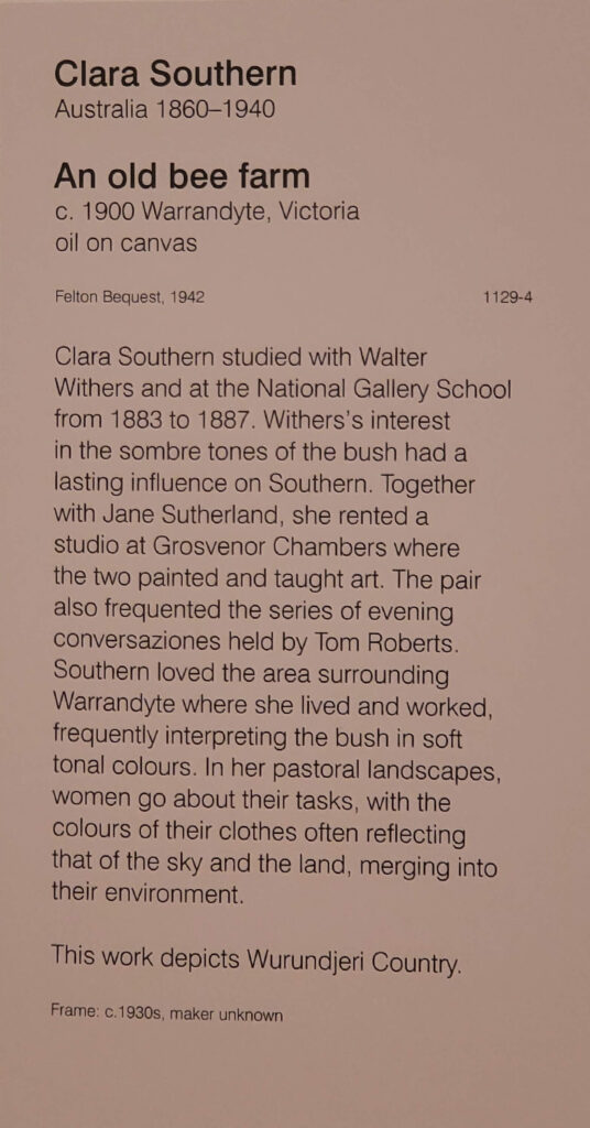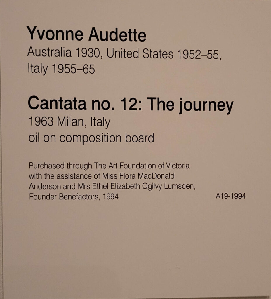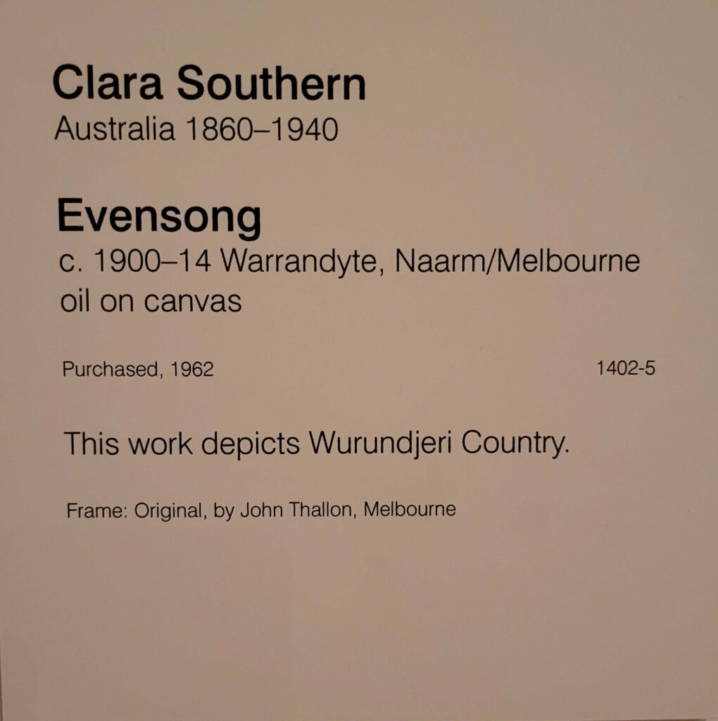 Most of the things I absolutely love – Fred Williams’, the Brett Whitely, were still there, and there was a lot more women’s art in evidence (yay). So most of my pix are of women’s art, most of which I hadn’t seen before (maybe some of the Clarice Beckett, and Ethel Carrick but not Yvonne Audette, Mary Swanzy, Iso Rae, Emma Minnie Boyd and more.. where have they been (don’t answer that question). Anyway, lovely to see them.