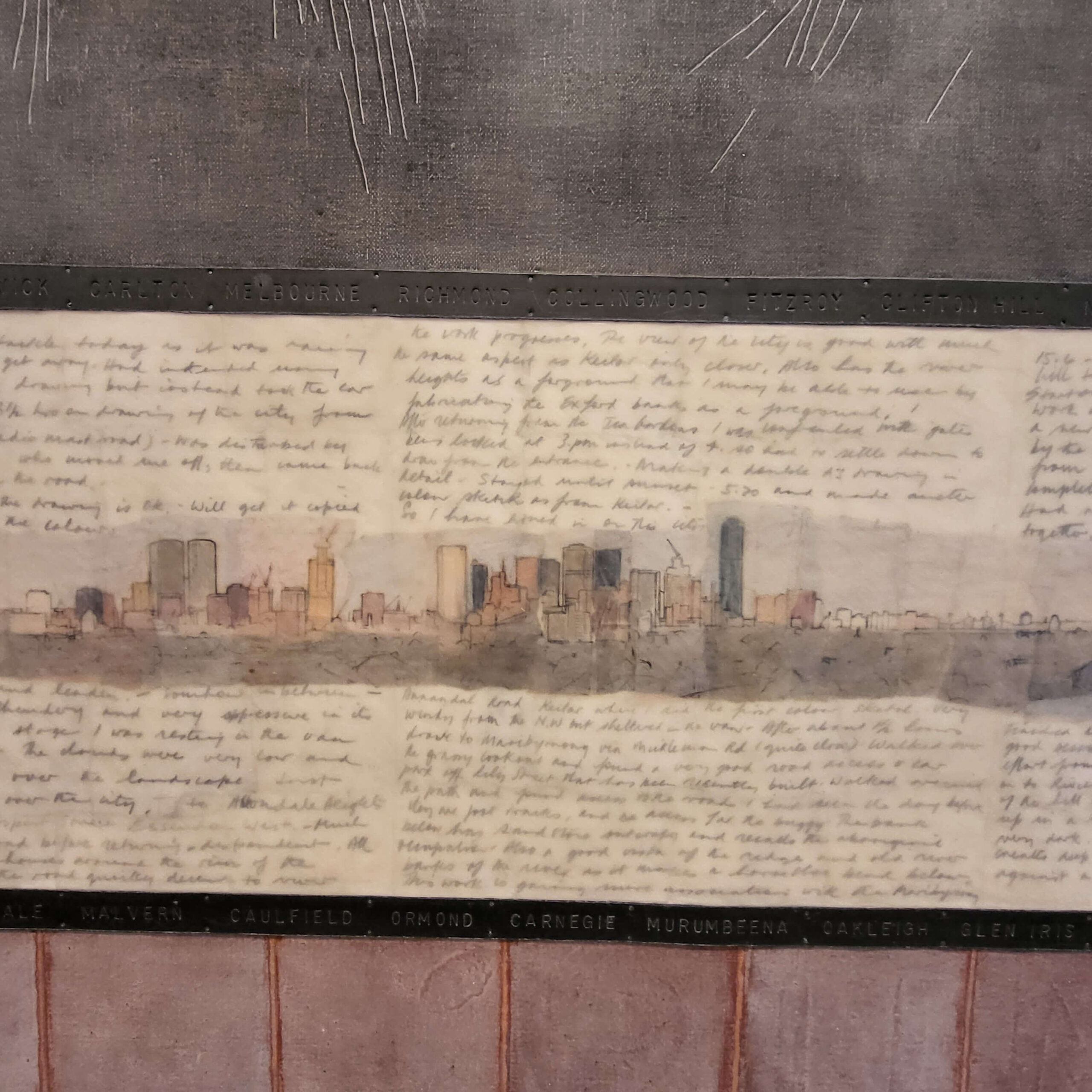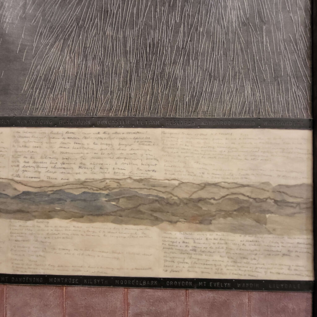 That particular piece is on a National Geographic pull out map, then I did some rubbings on the tiles and drains at Sturt, and added on a heap of bits. Why aren’t I doing that any more? maybe because I stopped doing large 2d works, more or less when I stopped going to Willoughby Arts Centre, maybe? So those big map pieces are for that.