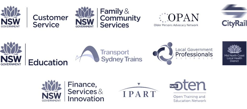 • Government and Public Sector: ABC, NSW Education, Sydney Trains, IPART, NSW Health.