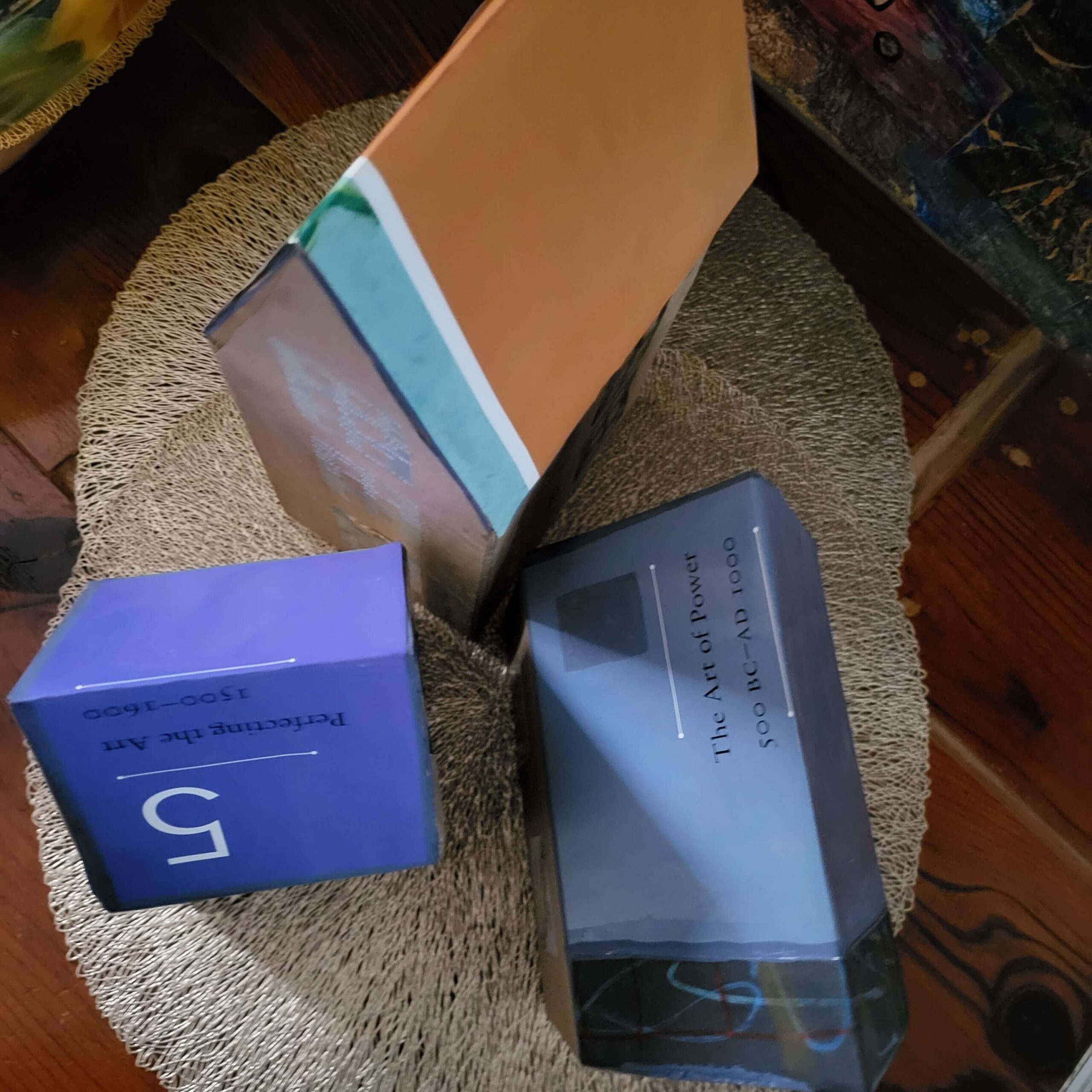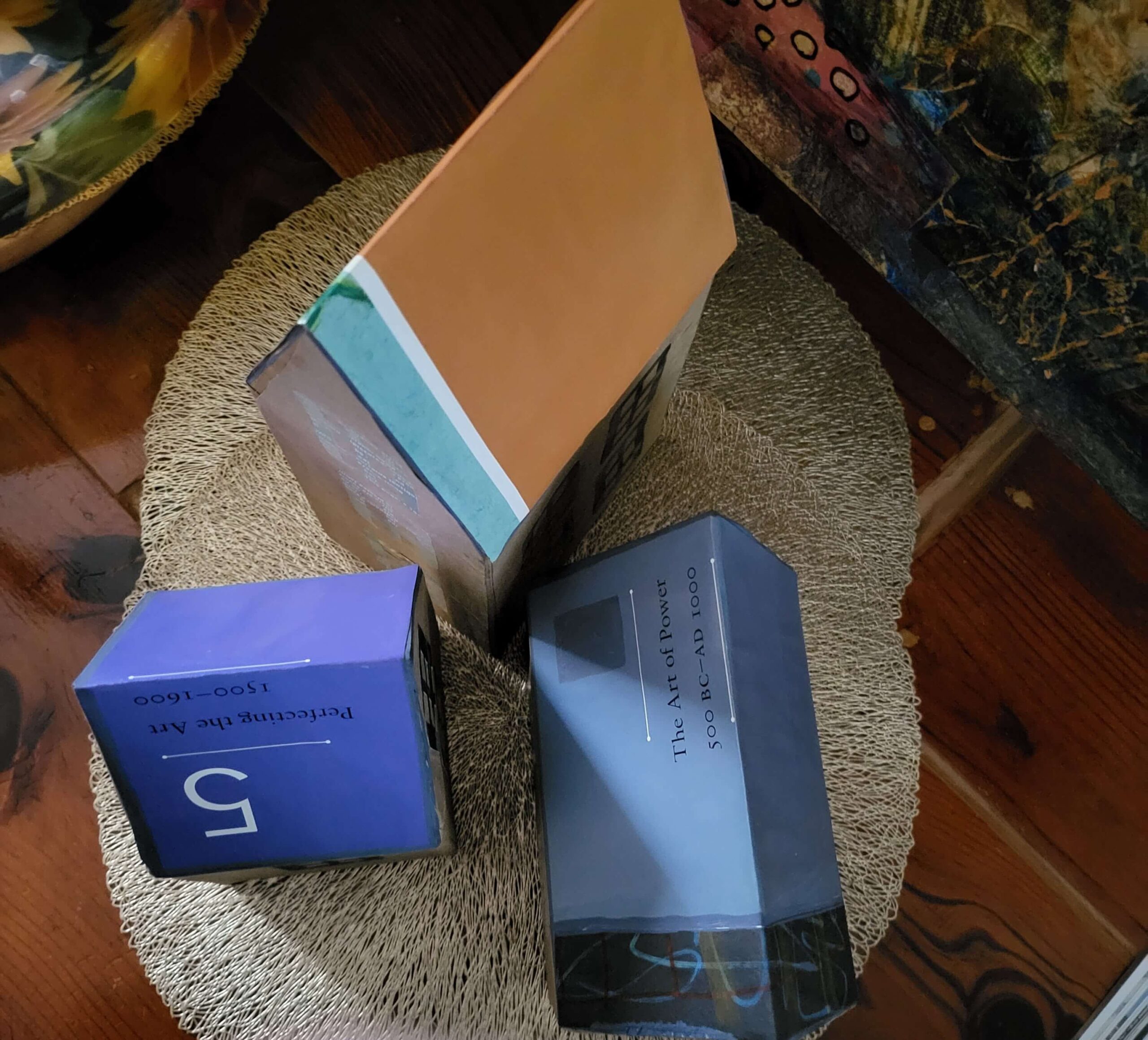 The roofs are from some beautiful full colour divider pages in What Makes a Masterpiece (a book whose insides have already become collage here and here at least). The divider pages have chapter numbers. In the video you will see each roof has a number on it, but in fact only number 5 lives on – i have covered the gorgeous blue grey roof (with a posca marker), and added a stripe of the charcoal Frankie page to cover what was a red piece on the roof (i found the red pulled my eye away from the other more muted colours. Look towards the end of the photos below to see it.